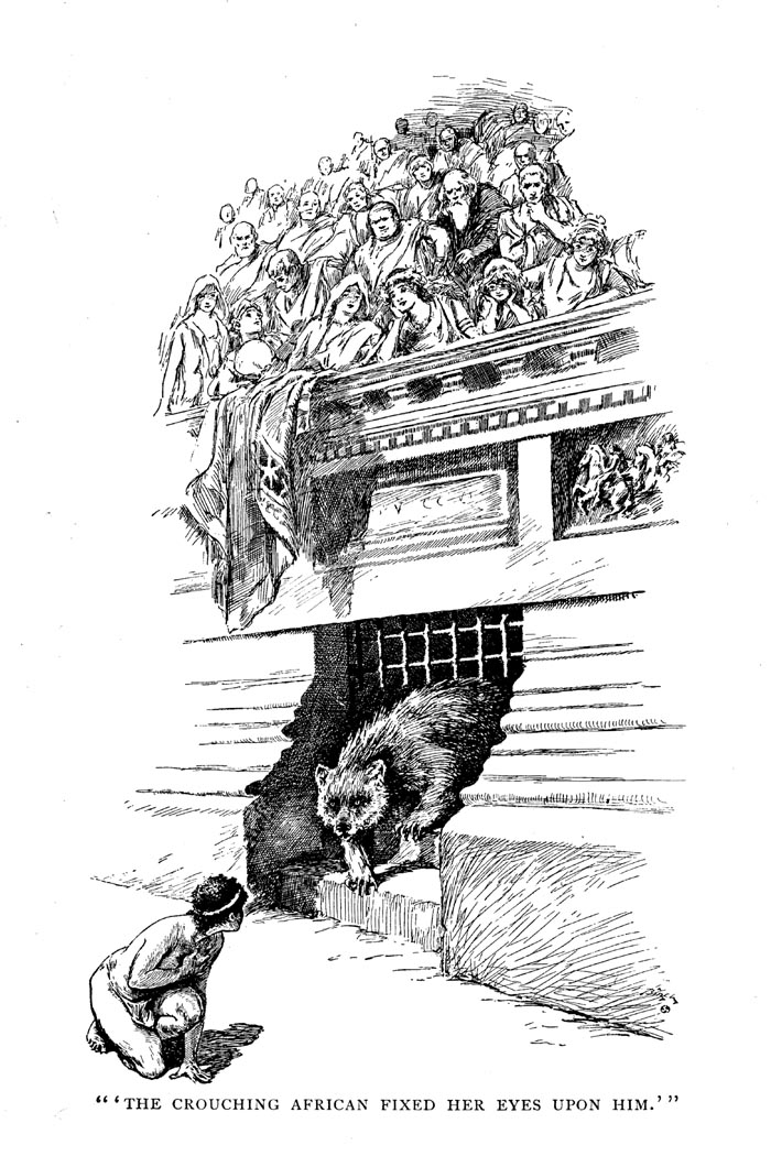"People's sensibilities were different in those days," said her husband. "I don't suppose I could do such a thing now. After a time she was brought out and left entirely alone in the middle of the great space. She was nearly frightened to death by the people and the fear of some unknown terror. Trembling from head to foot, she looked from side to side, and at last sank crouching on the ground. Everybody was quiet, for it was not known what was to happen next. Then a grating sound was heard, with the clank of an iron door, and a large brown bear appeared in the arena. The crouching African fixed her eyes upon him, but did not move.