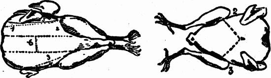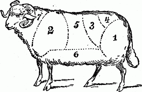 NOTE.—A saddle of muton or double loin is two loins cut off before the carcass is split open down the back. French chops are a small rib chop, the end of the bone trimmed off and the meat and fat cut away from the thin end, leaving the round piece of meat attached to the larger end, which leaves the small rib-bone bare. Very tender and sweet.