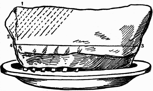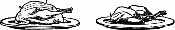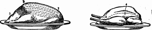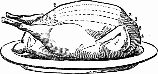 When carving use a chair slightly higher than the ordinary size, as it gives a better purchase on the meat, and appears more graceful than when standing, as is often quite necessary when carving a turkey, or a very large joint. More depends on skill than strength. The platter should be placed opposite, and sufficiently near to give perfect command of the article to be carved, the knife of medium size, sharp with a keen edge. Commence by cutting the slices thin, laying them carefully to one side of the platter, then afterwards placing the desired amount on each guest's plate, to be served in turn by the servant.