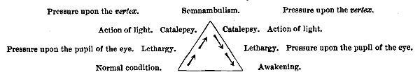 Metallotherapie, which was called into existence by Dr. Burg, and further extended by Dr. Gellé, contains a special point of interest—the so-called transference in the case of hysterically or hypnotically affected persons. Transference is caused by electro-magnetism, which has this peculiarity—that in the case of specially sensitive persons it can transfer the bodily affection from left to right, and vice versa. The transference of paralysis, the cures attempted on this plan, and the so-called "psychical transference," which contains special interest for graphologists, are at the present time still open questions, as well as the closely connected theory of human polarity; and the odic experiments of Dr. Chazarain are yet waiting for their confirmation. At present the problem of the connection between magnetism and hypnotism is under investigation, and in such a manner that we may hope for a speedy solution.