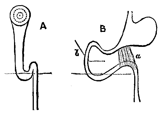Now, the absolute constancy of the curve of the duodenum, the complete fixation of its fourth portion, the position of the pancreas, and the place of entry of the ducts of the pancreas and liver, are all component parts of a siphon trap, whereby gases generated below the duodenum are prevented from passing upward. A reference to the accompanying diagrams will make this quite clear. A is a diagram of a siphon trap copied from Parkes' hygiene. B is a very diagrammatic outline of the stomach and duodenum, a is intended to mark the position of the fibrous band, or musculus suspensorius duodeni; and b the position of entry of the ducts of the liver and pancreas. The duodenum, then, is a siphon trap, and a most efficient one. Now, the efficiency of a siphon trap depends not only on its shape, but what is absolutely essential is that the curve must be kept constantly full of fluid, without which it ceases to be a trap, and would allow gases to ascend freely. The position of the place of entry of the ducts of the pancreas and liver assures that this sine qua non shall be present. The discharge of the secretions of the pancreas and liver, although more active during and after feeding, is practically constant, and so insures in an admirable manner that the curve on which the efficiency of the trap depends shall be constantly kept full not only with fluid, but, as I would suggest, antiseptic fluid. There is no other trap in the intestinal canal, but the peculiar position of the colon would no doubt have more or less effect in preventing gases ascending through the ileo-cæcal valve.—Lancet.
