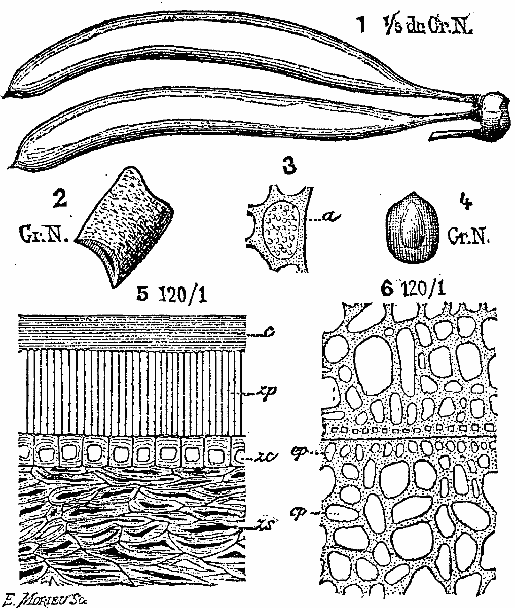 As for the seed, which is of a brown color and provided with a hard, shining skin, that is 0.4 inch long, 0.3 inch wide, and 0.2 inch thick. It is oval in form, with quite a prominent beak at the hilum (Fig. 4). The margin is blunt and the two convex sides are provided in the center with a gibbosity limited by a line parallel with the margin, and this has given the plant its specific name of biglobosa. The mean weight of each seed is 4½ grains. The skin, though thick, is not very strong. It consists, anatomically, of four layers (Fig. 5) of a thick cuticle, c; of a zone of palissade cells, z p; of a zone of cells with thick tangential walls arranged in a single row; and of a zone tougher than the others, formed of numerous cells with thick walls, without definite form, and filled with a blackish red coloring matter, cs. This perisperm covers an exalbuminous embryo formed almost entirely of two thick, greenish yellow cotyledons having a strong taste of legumine.
