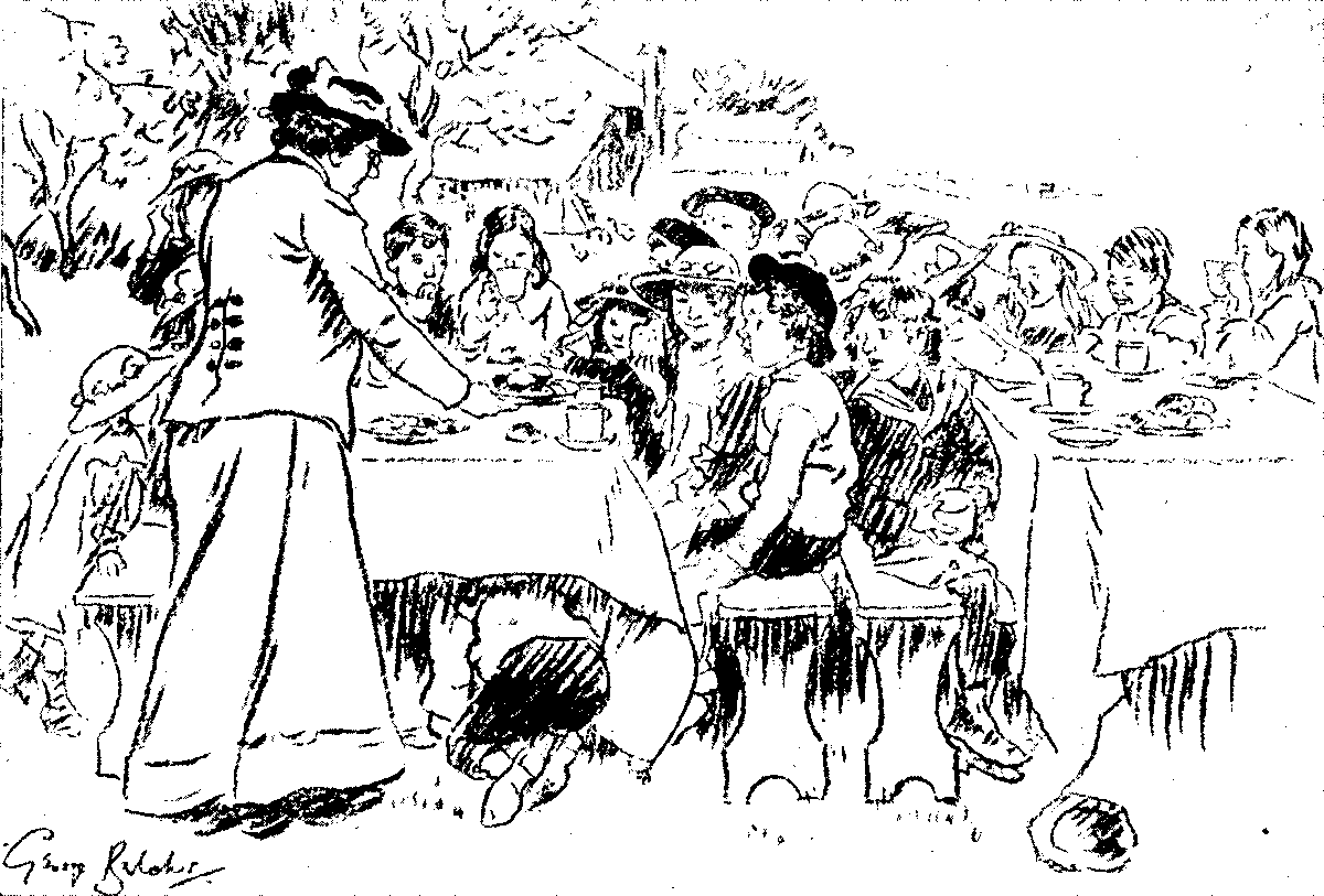Polite little boy (suffering from repletion). "Oh, please Miss, don't ask me to have any more; I can't say no."