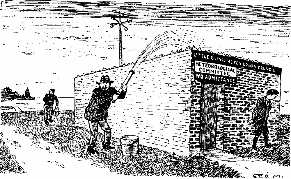 This picture illustrates the deadly struggle which goes on daily between rival seaside resorts. It represents a party of hirelings in the pay of Wobblethorpe-on-Sea engaged in running up the rainfall of Little Blinkington.