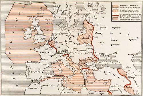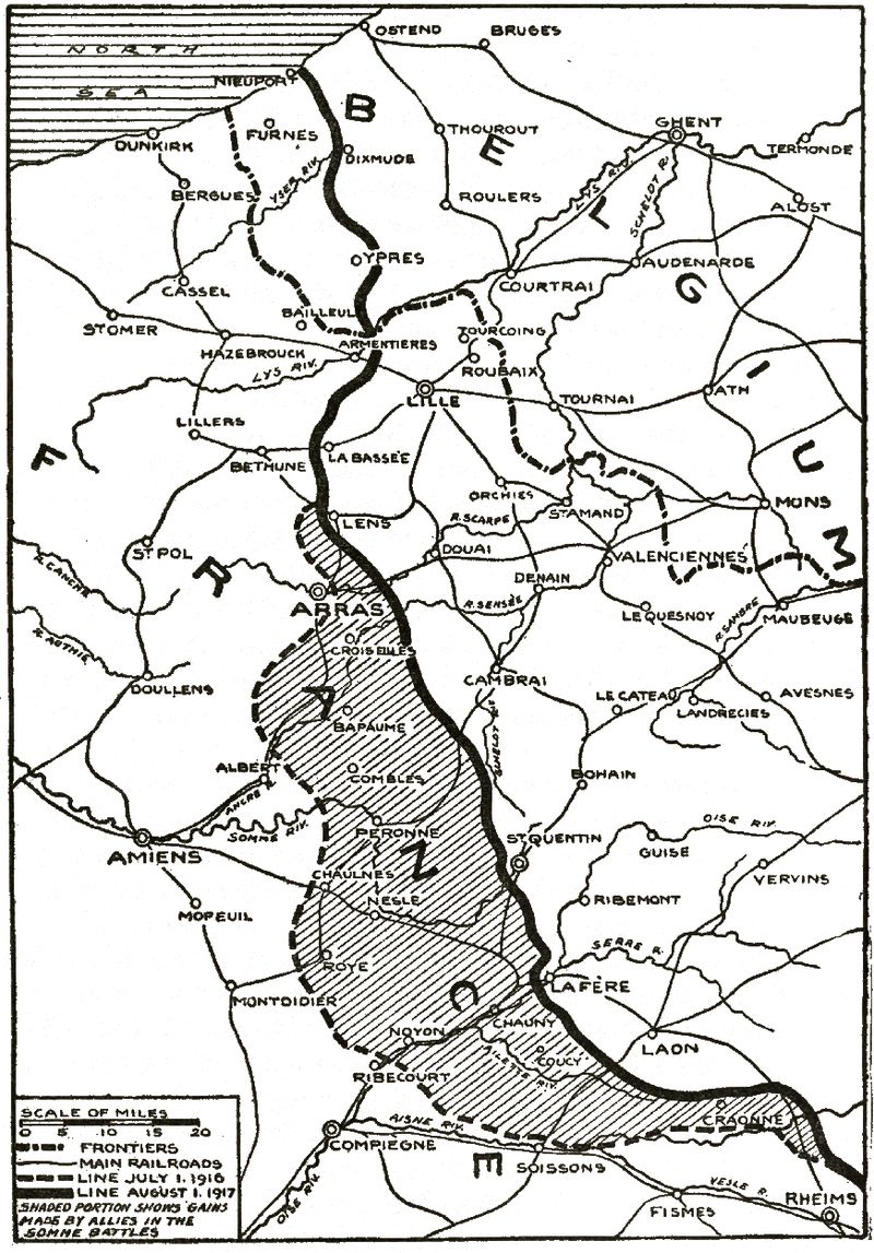 The first month of the Allied offensive on the Somme front closed quietly. The British and French forces had every reason to feel encouraged over their successes. In the two thrusts since July 1, 1916, they had won from the Germans nearly twenty-four square miles of territory. Considering the extent to which every fraction of a mile was fortified and defended, and the thoroughness of the German preparations to make the district impregnable, the Allied gains were important. As a British officer said at the time, it was like digging badgers out of holes—with the proviso that every badger had machine guns and rifles at the hole's mouth, while the approach to each was swept by the fire from a dozen neighboring earthworks.