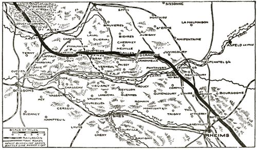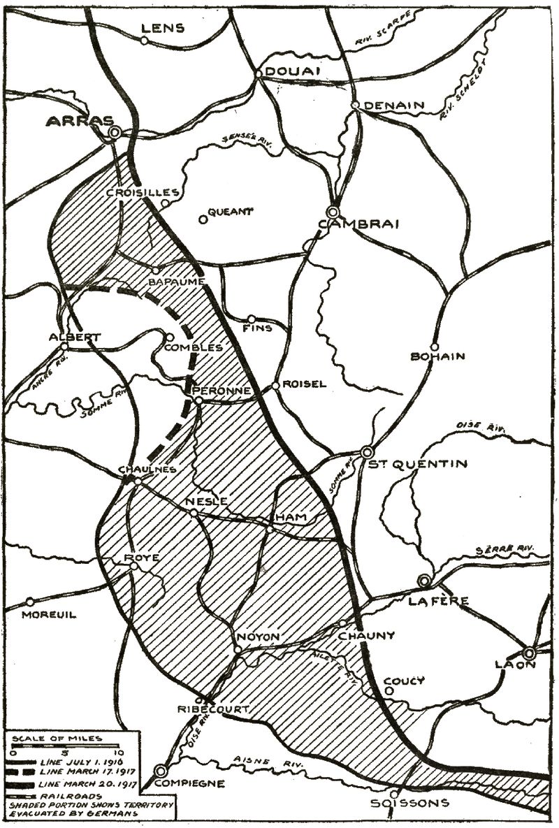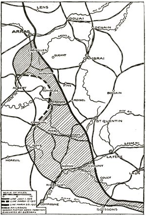 Southwest of Barleux the French infantry in a single push carried three successive German lines and advanced over a mile, which brought them to the outskirts of Berny and Deniécourt. To the south, by a well-planned enveloping movement, the village of Soyécourt was carried, and here a whole Prussian battalion was cut off and surrendered after a short resistance. South of Vermandovillers, where the Germans occupied a portion of the village, the French launched an attack on the German front in the afternoon, but it was night before they could break through north of Chilly. The French pushed on through the breach, forcing the Germans to retire to their second line, leaving 1,200 prisoners, guns and machine guns in French hands. Desperate attempts were made by the German General von Hein to recover the lost ground. Before the French had time to consolidate their (p. 019) positions he launched six counterattacks, all of which failed under the French barrage of fire. On September 4, 1916, the French made 2,700 prisoners between Barleux and Chilly.[Back to Contents]