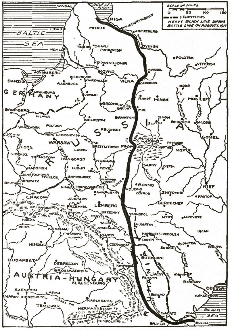 On the same day, August 24, 1916, the British troops on the north of the Somme attacked the German positions in the Maurepas region and carried with a rush that part of the village still held by the Germans and the adjoining trenches, taking 600 prisoners and eighteen guns. South of the village the Germans made a violent attack on the British position at Hill 121, but owing to the concentrated fire of artillery which mowed them down they were unable to reach the British lines at any point.[Back to Contents]