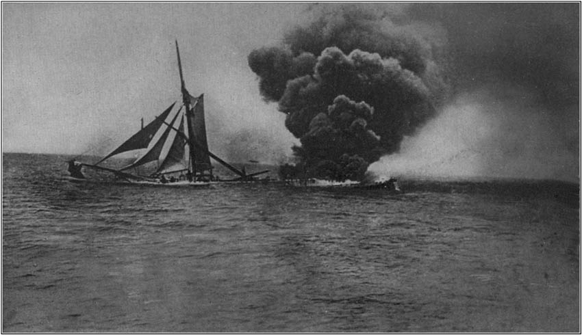 It was now essential for us to put an end to this deadly combat, for English torpedo-boat destroyers were hurrying on to the calls of distress of the steamer. Big clouds of smoke against the sky showed they were coming towards us under full steam. The ship was by this time listing so heavily that it was evident we need waste no more of our ammunition, and besides the appearance of another big steamer on the southern horizon was an enticing inducement to quit the battle scene and seek another victim. We cast a last look on our courageous adversary who was gradually sinking, and I must add [106]it was the first and last prey whose end we did not have the satisfaction to witness. We had been truly impressed by the captain's brave endurance, notwithstanding his lack of wisdom, and we knew that the men-of-war were coming to his rescue. We read in the papers, on our return to a German port, that the "Vosges" had sunk soon after we had departed, and what remained of the passengers and crew were picked up by the English ships. The captain was rewarded for his temerity by being raised to the rank of Reserve officer, and the crew were given sums of money; but all the other officers had perished, as well as several sailors and a few passengers, who had been forced to help the stokers in order to increase the speed of the flying steamer.