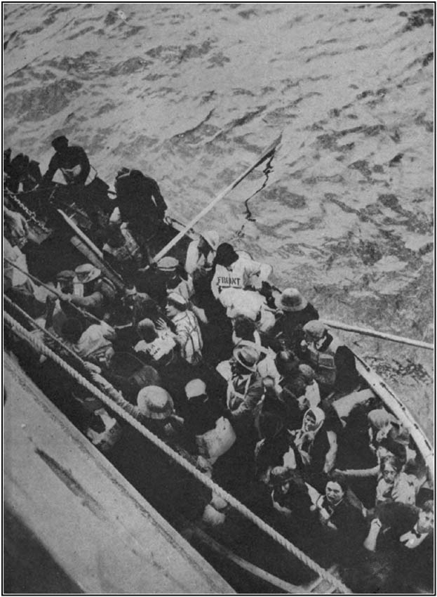 PASSENGERS AND CREW LEAVING A SINKING LINER TORPEDOED BY A GERMAN SUBMARINE IN THE MEDITERRANEANToList