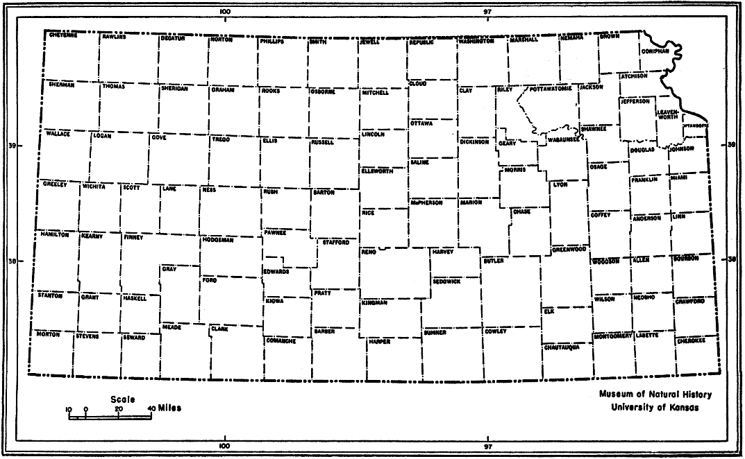 Kansas has been described topographically, climatically, and otherwise ecologically many times in the recent past; the reader is referred to the excellent account by Cockrum (1952), which treats these matters from the viewpoint of a zoologist. For present purposes it will suffice to mention the following characteristics of Kansas as a place lived in by birds.