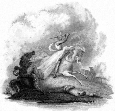 On the day appointed they met accordingly, armed at all points, on horseback, the King, the Prince of Wales, and the whole court of England being spectators. Presently, upon sound of trumpet, a most gallant combat commenced between the two stranger knights. Both their spears were broken into splinters upon each other’s shield, yet neither of them was cast from his saddle. Instantaneously, and, as it were, by mutual consent, they alighted, and drawing their good swords, renewed the combat on foot, till having with equal valour and discretion fought a considerable while, both their weapons became useless, and they were obliged to come[Pg 25] to close grapple, and at length by wrestling both fell locked together, still contending for the victory. It was gained by Sir Thomas de la Marche, by means which, though lawful in the duel, would not have been permitted in the courtly joust and tournament. He had armed the joints of his gauntlet with sharp pricks of steel called gadlings, and he struck them with such force and frequency through the small distant bars of his antagonist’s visor, that Visconti was compelled to call for mercy. The King thereupon threw down his warder, the marshal cried Ho! and the combat ceased. Edward adjudged the victory to the Frenchman, declaring that the vanquished was at his mercy, agreeably to the laws of arms.[24]
