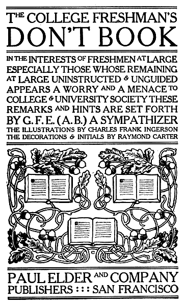 HERE ENDS THE COLLEGE FRESHMAN'S DON'T BOOK BY G. F. E. (A. B.) A SYMPATHIZER. DECORATIONS AND INITIALS BY RAYMOND CARTER ILLUSTRATIONS BY CHARLES FRANK INGERSON PUBLISHED BY PAUL ELDER & COMPANY AND PRINTED FOR THEM BY THE TOMOYE PRESS UNDER THE DIRECTION OF J. H. NASH IN THE CITY OF SAN FRANCISCO DURING THE MONTH OF MAY AND YEAR NINETEEN HUNDRED & TEN