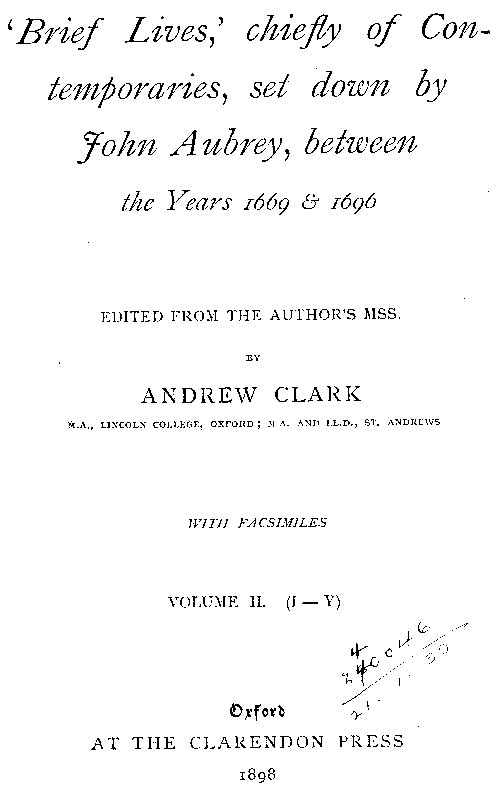 [1321] The slip is perhaps of date Dec. 1681, or a little later: cp. Clark's Wood's Life and Times, ii. 558, iii. 3. The index to the MS. is dated July 1, 1681 (MS. Aubr. 8, fol. 5).