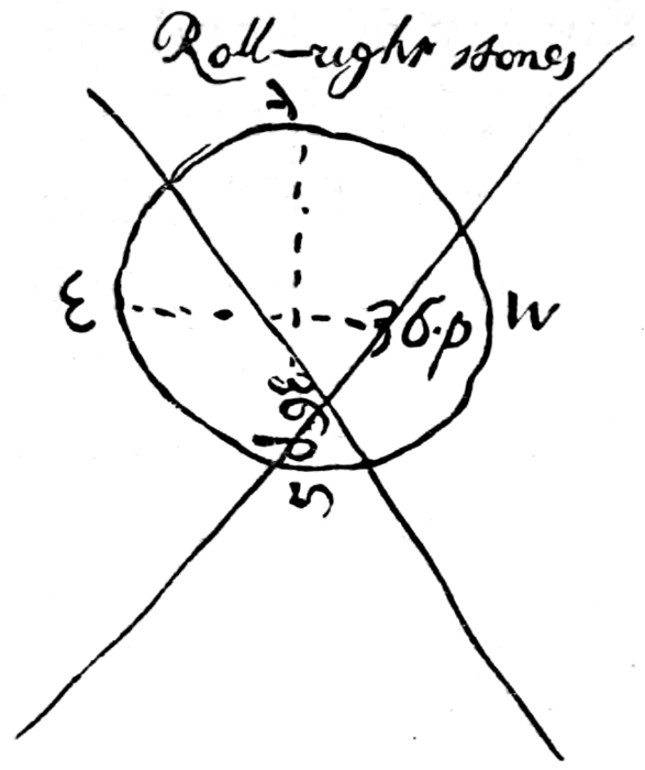 [1350] i.e. except the first and second stones, they are more or less (plus, minus) about 4 feet high. The diagram gives Aubrey's measurement of the circle: p. = paces.