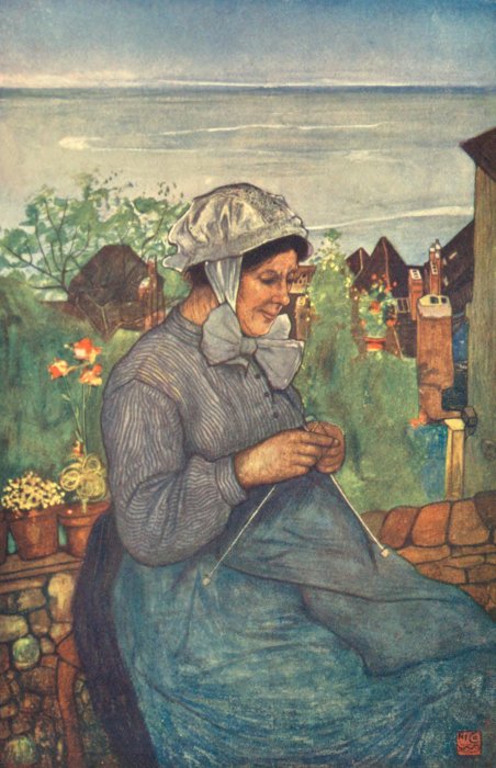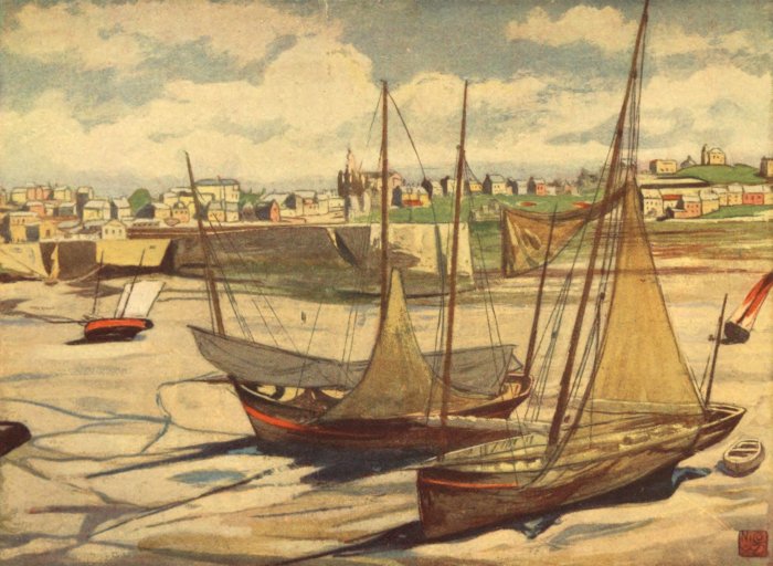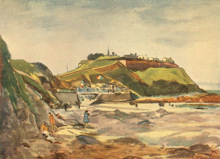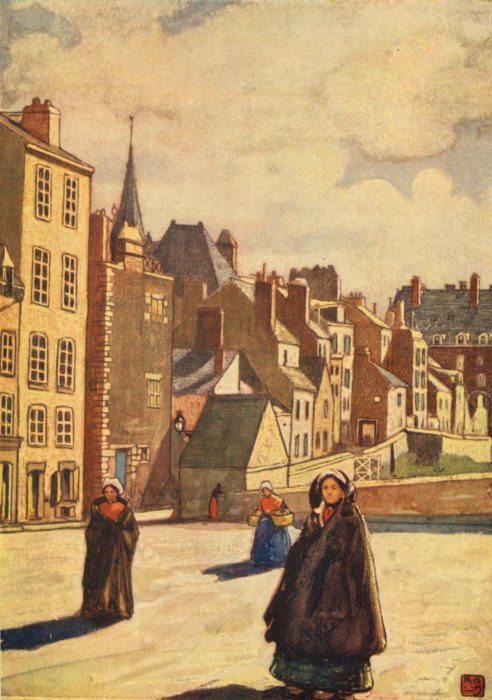 The chaffering goes on hotly; two fine mackerel are handed over at thirteen sous, four good ones, not quite so fine, at sixteen sous. All the dealing is in sous. Strange, evil-looking fish with large heads are sold for a song, and each customer as she gets them—for it is nearly always a she—slips them into her string bag, and goes on her way rejoicing, with a cheap and wholesome dinner for the young ones at home. High on the cliff across the water, is the stiff new little church—there is another in the town below—and behind it, on the windswept cliff, the Le Pollet cemetery, filled with the cheap wooden crosses laden with those tawdry ornaments that mean so much and tell so little. But the Le Pollet cemetery does not account for more than a fraction of its dead, for many a man and lad lie out beyond the point in the shifting sea, and the wives and mothers at home have no graves on which to lay their hardly bought offerings. On Le Pollet, under the renowned General Talbot, the English erected a fort called the Bastille, a name still retained by its site.