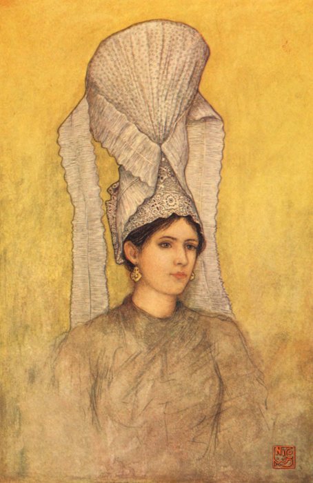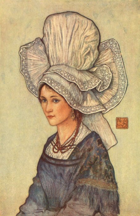 In regard to the people, what there is to say has been said in the various local chapters. The quaint costumes, which are familiar to us from many a10 picture, are fast dying out; in Normandy one sees less of them than in Brittany; here and there, it is true, we find a local fashion in caps, as at Valognes; and still on feast-days and fair-days some damsel appears in the wonderful erection of stiffening and beautiful hand-made lace which her grandmother wore, to be the envy of her neighbours; but in an ordinary way these things are not seen. “On y cherchent vainement ces riches fermiéres de la plaine et du Bessin, dont les hautes coiffes garnies de dentelles et les bijoux Normandes attiraient tous les regards.”