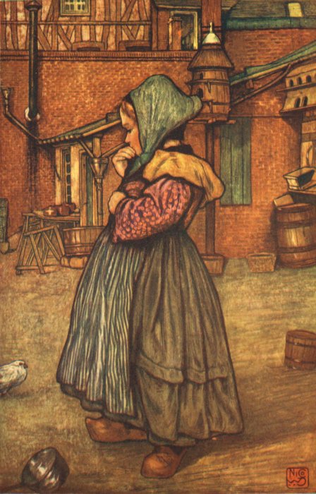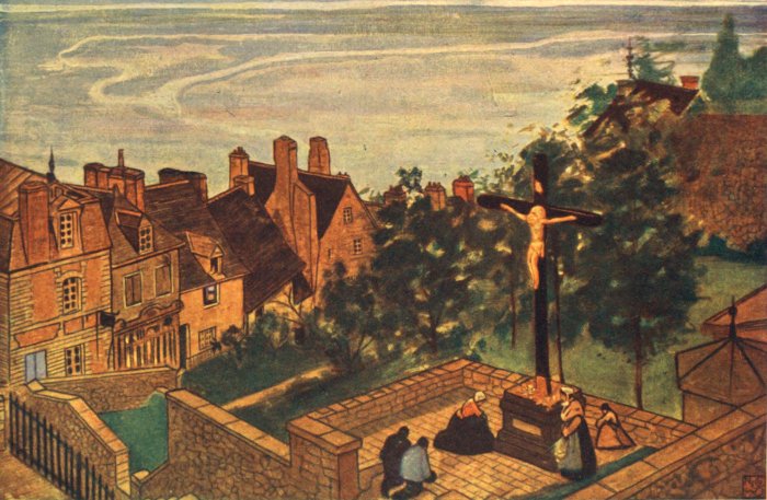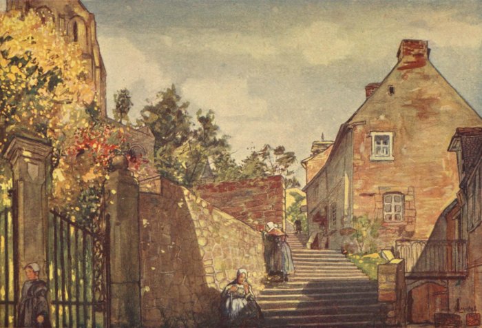 If we go into St Jacques late in the afternoon, when the sun is flooding that glorious western rose-window, we shall find the whole building filled with opalescent light. Soft patches of transparent colour, amethyst and gold, far more glorious than even the rich blue and orange of the glass through which they filter, creep slowly across the aisle and climb the pillars. They rest upon the bowed shoulders of an old peasant woman, who sits with hanging head. Her plain stuff dress and the print cap tightly fitting her grey hair, the blue check apron telling of days of toil, are all suddenly transformed into something “rich and strange.” But she sits there with the dark beads falling one by one through her work-worn fingers, heedless of the glory in which she is bathed; and if you go nearer you will see that poor proud face drawn by lines of sorrow, and every now and then the fingers are interrupted in their166 work to wipe off those too insistent tears; evidently no ordinary case this, but a woman who has suffered trouble, and who comes to seek peace, though happiness has left the world so far as she is concerned.