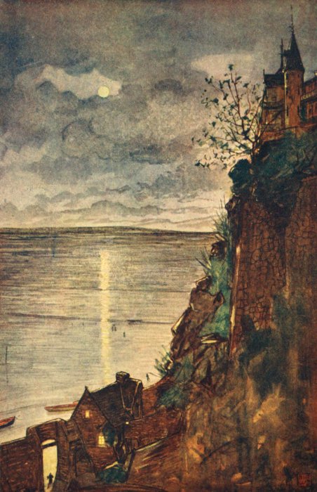 Once inside the gateway there is a narrow street with the entrance of the Poulard Hotel on one side, and small recesses with seats and tables144 for refreshments on the other; while the street itself is spanned a little higher up by a massive gateway called La Porte du Roi. In the season the hotel is generally crammed, and largely by the English. It is frequently necessary to get put up in one of the dépendances, and for sheer wonder it is hard to beat that which stands some fifty feet higher up the cliff. Entering the main hotel to go to this, one traverses many flights of stairs, and finally, coming out by a wholly unexpected door in the wall, finds oneself on the rugged face of the cliff, with rough-hewn stone steps stretching higher still to the number of fifty or sixty. These lead to a terrace whereon is a large white and red house; and from the terrace what a view! Sea and sky, and the great green scimitar of the French coast, low-lying in the distance, are the principal components. The dépendance is built absolutely plumb with the rock, so by leaning out of one of the long French windows in the front, one might fling a pebble into the murmuring lapping water below; and at night when above gleams “the intense clear star-sown vault of heaven,” and below the tide steals up, and there arises the gentle sucking of the tethered boats, one might well imagine oneself in Mohammed’s coffin, swung between heaven and earth.
