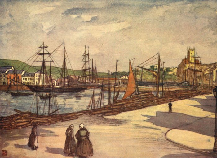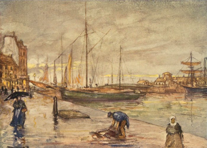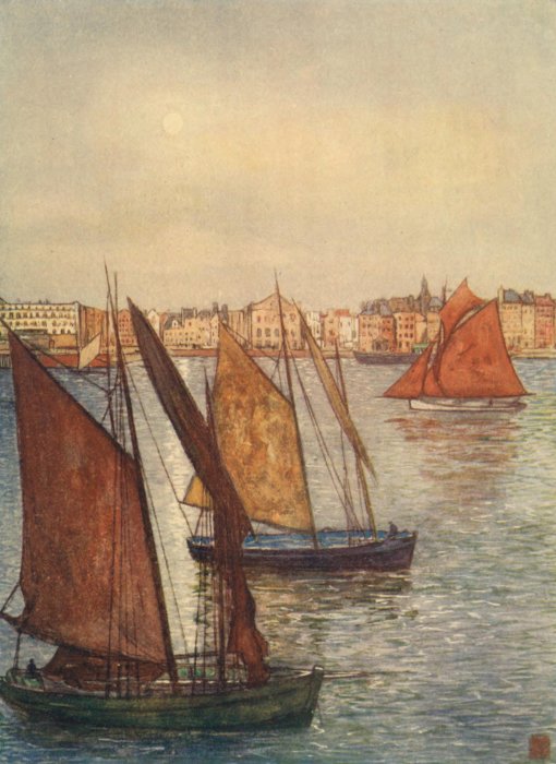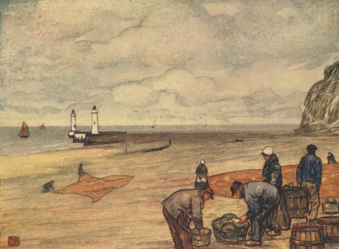 On the quay is the fish-market, and outside it a mass of fisher-folk broken up into groups. The men are nearly all rust-coloured in complexion, with hair that curls fiercely and thickly, and among the younger168 ones is to be seen not infrequently that type of face which, idealised, appears in the portrait of Gilliatt, in the English translation of Les Travailleurs de Mer, a face of a short oval, with small pointed chin, and mobile, sensitive lips. Yet others there are as square-jawed and bull-dog, as ruffianly in expression, as the lowest among the sailors in London by the river.