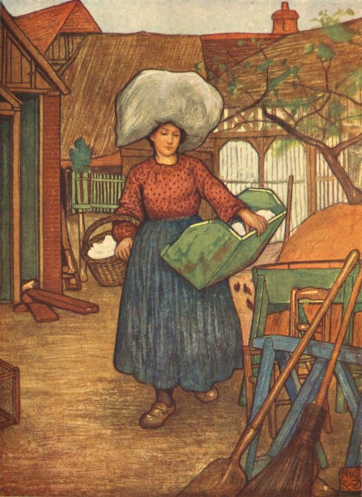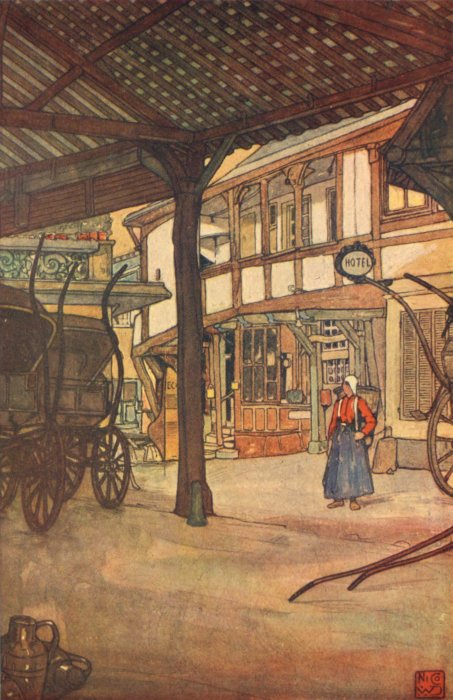 But Dieppe deserves some consideration apart from its harbour and its beach; it is no mushroom town of villadom, but has an old-world flavour, and a delightful mingling of simplicity with its fashion. We can see in it a series of charming pictures. There is, for instance, a long, narrow, cobble-paved street passing through the middle, running more or less parallel with the front, and cut off from it by a double wall of houses. But, alas, there are few old houses, for gable end and ancient woodwork went down before the furious bombardment of the combined English and Dutch fleets in 1694, when the bombs, falling in all directions, set the place on164 fire. After having done such damage that the whole town had to be rebuilt, the fleet sailed away to Havre. It is said that some of the rich inhabitants at the first sign of danger hid their valuables in the caves, which may be seen in numbers along the limestone cliffs, and that 4000 houses in all were burnt. Thus it is that there is nothing to be seen in the streets anterior to this date. Nevertheless there is a quaint irregularity in the nondescript architecture that is very charming. And on a Saturday morning the long street is lined by the market women, who come in to dispose of their country produce. They have no stalls, but sit on the edge of the pavement on the sunny side, each one with her basket or baskets ranged beside her. Dazed hens with tied legs, faintly expostulating ducks, baskets of pearly eggs, wedges of butter under cool green leaves, great masses of roses and other flowers—such are the goods for sale, and each one represents a large amount of hard work and patience. The women chatter gaily, comparing produce and prices, their pleasant, brown faces shining the while in the sun, until perhaps the babel is for an instant stilled by a funeral passing down the narrow street. The walking priests, in their birettas, lead the procession, followed by the acolytes and the silent coffin; they wind slowly over the cobbles, and the solemn dirge rises on the summer air; but it has passed, and is forgotten, and all is happy tumult once more.