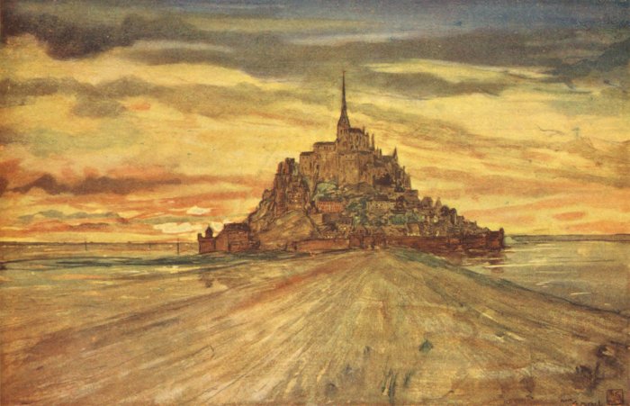 From the Pontorson road we approach the island, facing northward, and if we are fortunate enough to arrive in the evening when the sun is setting behind the line of sea in the west, we shall see a gorgeous vision,