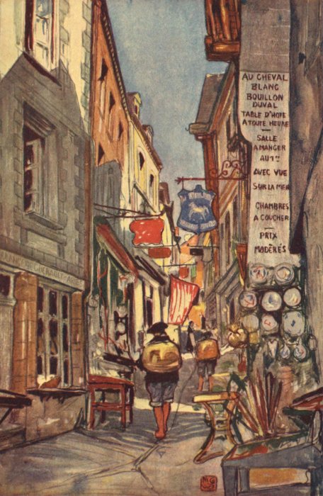 The flame-coloured glowing background shows up the Mount dark and sombre, yet not wholly unrelieved, because lit by gleams that catch the facets and angles innumerable that stud its surface. The wide stretch of level water gently heaving round the base gives a strange mystical sense of illimitable space, and this with the majesty of the rock fills any who have imagination at all with the same emotion and sensation of eternity and infinity as is aroused by the sound of grand music. Yet in the morning light, glowing with an extraordinary amethyst hue, the Mount is mystic and wonderful too; it has then a more joyous and softened beauty; seen in storm and rain it is forbidding, and the grandeur alone is predominant; in every season, in every phase of weather, one or the other of the characteristics that combine to make up its unsurpassable glory, its mystery, its grandeur, or its wonder, start out and proclaim themselves supreme. So that according to a man’s luck at his first approach will he be ready to exclaim, “How grand it is!” “How wonderful!” or “How beautiful!” The actual road over the sands is about a mile and a quarter in length. It was made in 1880, before which time the sands could only be crossed at low tide. It is built up high, and hedged on either side by a low wall. It is bare, exposed, and dusty. Around it lie the wide flats of half-uncovered sand, resembling those of the Northumbrian coast near Coquet Island. Yet though this approach in143 itself is slightly chilling to feelings of enthusiasm, its deficiencies are lost in the vision ahead, which grows each minute more and more detailed, more and more vivid. There is in reality only one hotel on the island to which any ordinary tourist would think of going. Its message has been proclaimed half a mile away, for directly mystery began to give way to detail, it could be seen, in letters six feet high, on every building of any size that rises up on the precipitous face of the cliff, that Hotel Poulard Ainé and its dépendances occupied all the prominent houses that were available. Some rival establishments have been set up by other members of the same family, but their light is a candle to the electric arc compared with the original Poulard, famous for its excellent and Brobdingnagian omelets.