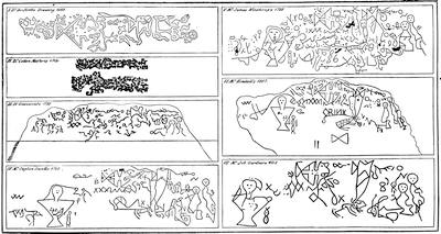 [1916] First series: vol. i., S. H. Parsons on discoveries in the western country; vol. iii., E. A. Kendall and J. Davis on an examination of the much controverted inscription of the so-called Dighton Rock; E. Stiles on an Indian idol. New series: vol. i., Rasle’s Abenaki dictionary; vol. v., W. Sargent’s plan of the Marietta mounds, etc.