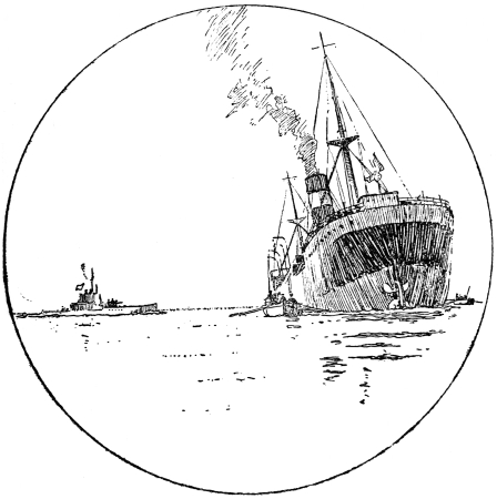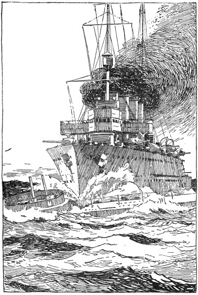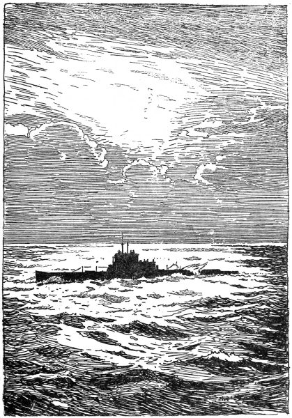 At 8 o’clock, then, on the finest summer morning of the year, Commander Cooper was making his passage at normal surface speed, when the horizon on his starboard bow began to be delicately shaded by faint pencilled lines. Ten minutes more and a number of ships were visible, two points on the bow, and five to six miles away. They were immediately in the sun, and blurred by the haze, so that it was impossible to detect their nationality. They might be our own squadron, coming back unexpectedly early, or more likely a hostile force running from them. The only thing certain was that they had sighted the submarine and were bent on her destruction, for they were all bows on, bearing down upon her at high speed—destroyers and cruisers—throwing up clouds of dense black smoke.