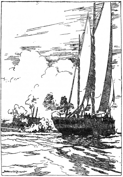 ‘The sun is sinking below the horizon; the chase has already lasted more than three hours. The decoy ship has long passed out of sight, and no new enemies have appeared. Suddenly shells begin falling close by. The Foxglove means to have another try as long as the light holds, and we feel that this is an impertinence. “Man the guns!”