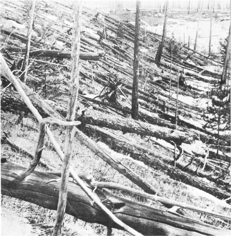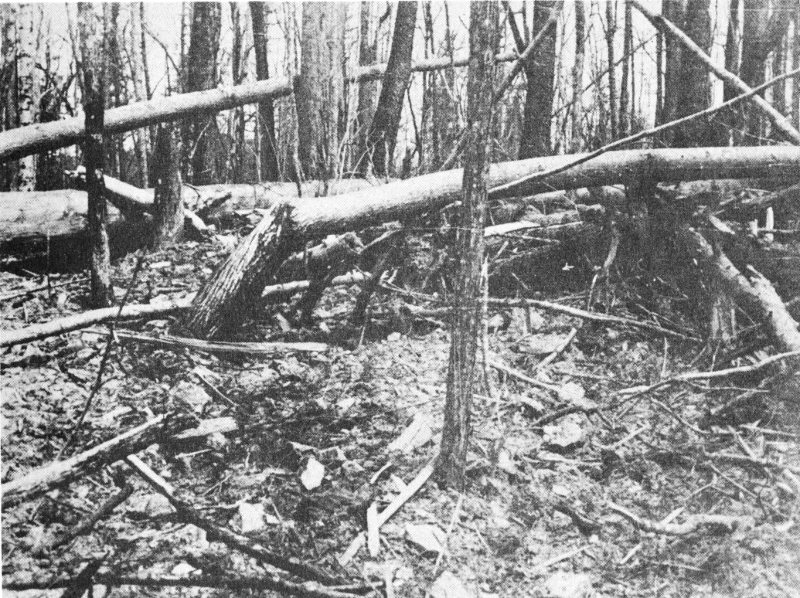 COURTESY OF E. L. KRINOV Splintered and broken trees at the site of the Ussuri fall.