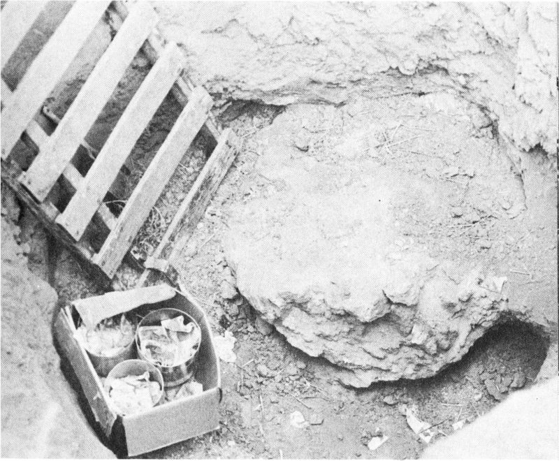 The Furnas County, Nebraska, stony meteorite in place at the bottom of its 10-foot “penetration funnel.”