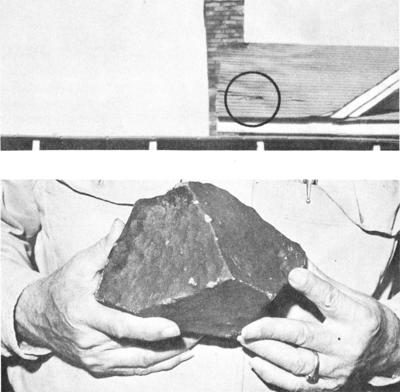 The farmer stacking hay heard several explosions, felt a violent air blast, and finally heard a solid object strike the ground “with a smack,” as he put it, “like a clod hitting the earth.” (Later, field searchers found that this man lived only about two and a half miles south of the point where the largest fragment of the meteorite fell.)