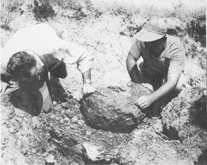 The excavated meteorite looked and felt like a huge stone. Actually, it was stony in nature, but of a texture so fragile that it had to be wrapped in tissue paper, then in burlap, and finally covered with a thick coating of plaster of Paris before it could be lifted out of the ground. Those in charge of the removal of the meteorite borrowed this procedure from the paleontologists, who use it in the removal of fossil tusks and bones that otherwise would crumble away.
