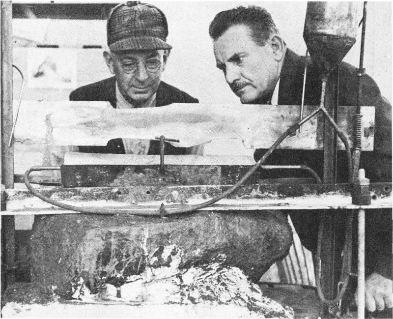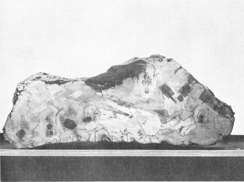After the great meteorite had been raised out of the excavation, it was taken by truck to the University of New Mexico, in Albuquerque. There it was put on display beside the smaller 130-pound fragment found in May. By careful measurements, scientists determined the weight of the main mass to be approximately 2,360 pounds—a record weight for stony meteorites.[1] This remarkable meteorite, known as the Furnas County, Nebraska, stone, is now a prized item in the collection of the Institute of Meteoritics.