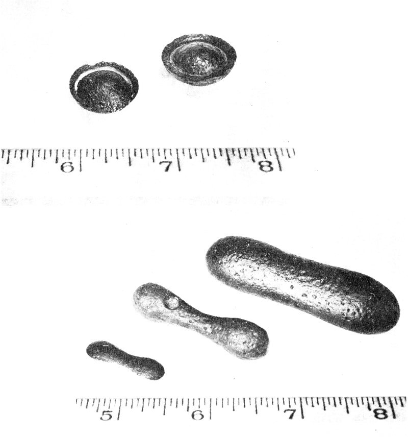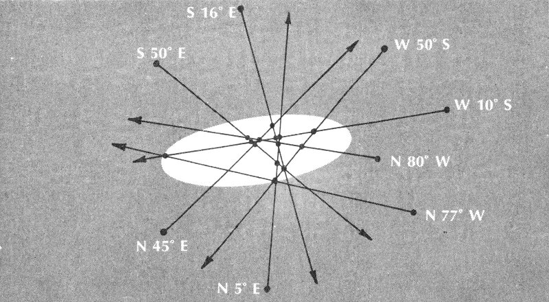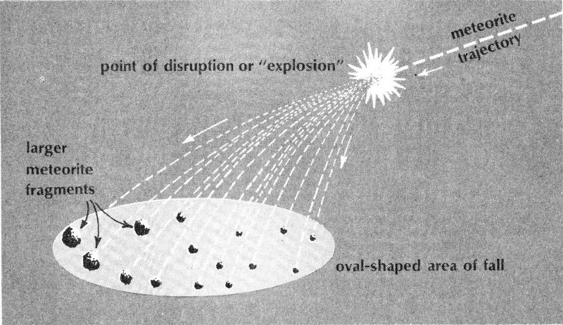 As more and more finds were made in the area of fall, we accurately recorded their weights and mapped their locations. In this way, we could tell how the pieces of the meteorite had distributed themselves according to size and weight over the oval-shaped area. The smaller and lighter fragments were slowed down by air resistance and fell first, while the 2,360-pound mass carried on beyond them and came to earth at the farthest point along the direction of flight.