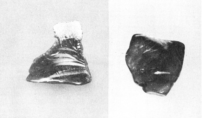 A member of this later and better-equipped expedition compared the Ussuri crater field to a bombed-out area. In fact, some of the meteorite specimens were fragments that closely resembled pieces of shattered shell-casing. The edges of these fragments were jagged and bent, and their surfaces, which often displayed a rainbow-colored sheen, were grooved and scarred by impact against the hard rock underlying the region in which the crater field had been formed. In rare instances, the investigators noted spiral twisting of the fragments, an indication of the unusually violent disruptive forces to which they had been subjected at impact.