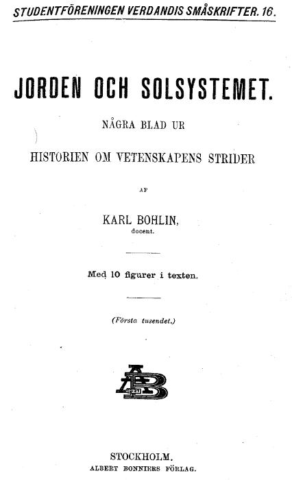 Vi veta äfven, att man icke alltid hyst samma åsikter, att folkens religiösa urkunder påbjuda en annan uppfattning och att, för icke allt för många mansåldrar sedan, läran om att jorden befann sig i evig hvila i världens medelpunkt till den grad genomträngde folkmedvetandet från ofvan allt ned igenom, att den, som då förkunnade våra dagars åsikt i frågan, ansågs för löjlig, när han icke drabbades af förföljelse.