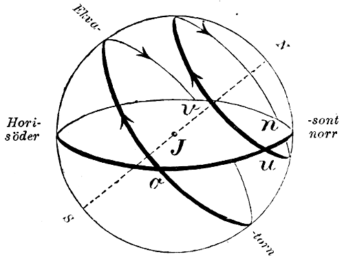 Innan vi öfvergå till det närmast följande utvecklingsskedet, som representeras af den s. k. Pytagoräiska skolan, skola vi korteligen anföra hufvuddragen af stjärnornas skenbara rörelser på himmelen, sådana som de omedelbart te sig för oss och som man redan under forntiden hade iakttagit dem. Först och främst ser man, att det stora flertalet stjärnor från dag till dag och från år till år befinna sig i samma ömsesidiga lägen; de äro, hvad vi kalla fixstjärnor, och man grupperade dem för öfversiktlighetens skull redan i gamla tider i s. k. stjärnbilder såsom de allom bekanta Stora björnen, Orion o. s. v. Alla dessa stjärnor hvälfva sig för hvarje dag rundt med himmelen i vidare eller smärre cirklar. Men ibland dem finnes en stjärna som icke (för ögat märkbart) rör sig, utan ständigt[8] bibehåller samma läge på himmelen ett godt stycke öfver horisonten eller synkretsen, gränsen mellan jordytan och himlahvalfvet. Detta är den s. k. polstjärnan; i grannskapet af den samma är den punkt af himmelen belägen som benämnes norra himmelspolen, i närstående figur betecknad med N. Genom denna punkt och den motsatta punkten på himmelen (södra polen, S, i fig.) kan man tänka sig en axel dragen (världsaxeln), omkring hvilken himlahvalfvet med stjärnorna utför sin dagliga vridning eller rotation. En cirkel, som halfverar himmelen emellan de båda polerna benämnes ekvator; alla rörelser äro paralella med denna. En stjärna som ligger på ekvatorn går upp öfver horisonten rakt i öster (i punkten o i fig.), rör sig därefter i ekvatorns båge öfver horisonten; efter ett halft dygn går den ned i västpunkten v, är sedan osynlig under 12 timmar, för att därefter å nyo gå upp i o. Å figuren finnes äfven utmärkt en annan godtycklig stjärnas dagliga bana. Den går upp i u och ned i n; den är synlig öfver horisonten desto längre tid, ju närmare den ligger till nordpolen. Man inser äfven af figuren, att somliga stjärnor, nämligen de, som ligga i grannskapet af nordpolen, icke gå upp och ned; deras hela bana faller ofvan horisonten. Andra, hvilka ligga i grannskapet af sydpolen, kunna, som man ser, aldrig nå öfver vår horisont.