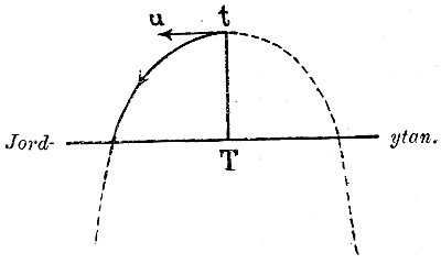 En kropp kännes tung, emedan den drages emot jorden, ungefär så som vore jorden en magnet. Samma orsak, eller kropparnas tyngd, åstadkommer att de falla mot jorden. Redan på Galileis tid var det fråga om, huru det skulle gå, om månen vore en tung kropp. Det var Newtons förtjänst att tänka ut denna tanke. Månen är — säger han — såsom hvarje föremål här på jorden en tung kropp. Den måste därför, såsom hvarje annan tung kropp, dragas emot jorden. Denna jordens dragningskraft på månen är tillräcklig att förklara månens omlopp kring jorden, i det att månens kringgående rörelse kring jorden är af samma art som rörelsen hos hvarje sten, som, sedan den blifvit kastad, i en krökt bana faller mot jorden. Men — frågar man med Galileis samtida — huru är det då möjligt att månen icke faller ned på jorden? Låtom oss föreställa oss, att vi från ett högt torn (Tt i ofvanstående figur) utkasta en[48] sten i vågrät riktning (t u). Enligt den ofvan omtalade lagen för kroppars tröghet, behåller stenen den framåtskridande vågräta rörelsen, han erhöll, då han utkastades, allt under det den samtidigt drages och faller i den lodräta riktningen mot jordytan. Det är lätt att förstå, att på detta sätt en böjd bana uppkommer. Den kroklinie stenen beskrifver kallas för en parabel och har det utseende, som angifves af den bugtade linien i figuren. Ju större den hastighet är, med hvilken stenen utslungas från t, dess längre ifrån tornets fot T nedfaller den, dess mera vidgar sig kastparabeln. I allmänhet taget kan man väl antaga jordytan platt, så långt man med en sten kan kasta. Men antag, att man kunde afskjuta en kula med huru stor hastighet, man önskade. Man skulle då kunna meddela den så stor begynnelsehastighet, att den icke skulle nedfalla på jorden förr än bortom synkretsen på ett ställe, som vi till följd af jordens rundning ej kunde se; ja, hastigheten skulle kunna ökas därhän, att kulan visserligen fortfarande skulle löpa framåt i en böjd bana, men i en bana af så svag krökning, att allt efter det kulan faller, själfva jordytan genom jordens rundning kröker sig undan under henne, så att kulan aldrig når till marken. Den skulle då komma att löpa rundt kring jorden såsom en ny måne, en kamrat till den ordinarie, hvilken, ehuru på betydligt längre afstånd ifrån marken, i själfva värket på alldeles samma sätt faller mot jorden, utan att falla ned (“faller rundt“).