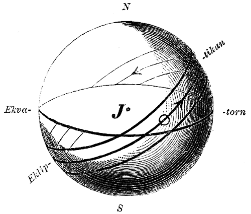 Kring ögat J, såsom medelpunkt, himmelssferen med ekvatorn och ekliptikan med solen (○), samt zodiakbältet, inom hvilket utom solbanan alla planetbanorna ligga.