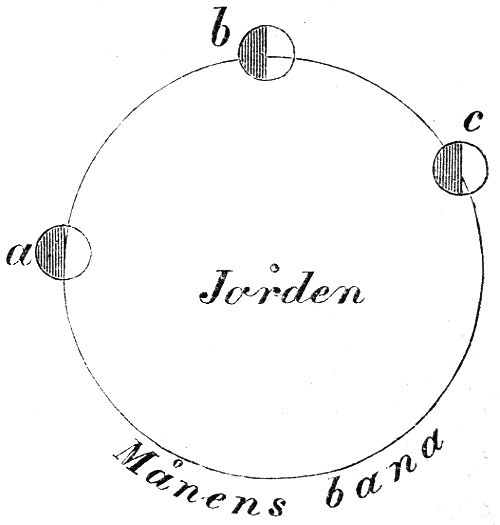 Pytagoras antages hafva lefvat mellan 570 och 470 f. K. Efter att länge hafva vistats på utländska resor, exempelvis i Egypten, bosatte han sig i Kroton, en grekisk koloni i södra Italien, och grundlade där en skola, som länge fortlefde i form af ett slags frimurareförbund af lärde män, hvilka sins emellan stodo i liflig samfärdsel, men af ett eller annat skäl afhöllo sig från att till en större allmänhet utbreda sina åsikter. — I olikhet med sina föregångare antog Pytagoras, att jorden var ett stort, fritt sväfvande klot, hvilket för öfrigt på alla håll var bebott af människor. Detta klot befann sig i medelpunkten af hela världen, som själf antogs vara klotformig eller, som man säger, sferisk. Till dessa åsikter synes han hafva[11] kommit, sedan han af månens faser slutit sig till att månen var en klotrund kropp. Det är nämligen lätt att se, att månen skall förete just sådana växlingar som dess faser, om den är klotformig. Ty af den halfva af månklotet, som är vänd mot oss, kunna vi blott se det parti, som är belyst af solen. Allt efter månens olika ställning till jorden och till solen, hvilken senare vi föreställa oss lysa från höger i närstående figur, skall månen sålunda presentera oss en belyst yta (eller fas) af olika storlek och form; och endast under antagande af att månen är klotformig kan man på detta sätt göra sig reda för dess bekanta växlingar ända från den fullt belysta månskifvan (i fig. vid a) till den smala skäran (läget c i fig.). Såsom månens yta, betraktad äfven med blotta ögat, gaf anledning att antaga, så förestälde sig Pytagoras den samma försedd med bärg och dalar samt land och haf; för öfrigt antogs den befolkad af ett jättesläkte. På samma sätt som månen var det, så antog nu Pytagoras äfven, att solen var klotformig, och likaså ansåg han planeterna såsom sferiska världar, liknande vår jord; blott till följd af deras stora afstånd från jorden syntes de så små och obetydliga. — Men fans det sålunda för öfrigt likhet mellan jorden och himmelskropparna, särskilt den bärgiga månen, hvarför skulle då icke äfven jorden vara klotformig så som de andra? Ett ytterligare stöd för åsikten om jordens sferiska form framgick af Pytagoras’ mening om förmörkelserna. — Redan före hans tid antog man, att förmörkelserna uppkomma därigenom, att mörka kroppar komma framför solen och månen och skymma dessa. Det antogs äfven allmänt, att månen var den mörka kropp, som vid solförmörkelserna trädde emellan åskådaren och solen. Om månens bana på himmelen precis sammanfölle[12] med ekliptikan, så skulle vi i själfva värket hafva en solförmörkelse i hvarje månad, i det att månen i sådant fall en gång för hvarje dess omlopp skulle passera icke blott förbi, utan rätt öfver solskifvan. Med afseende på solförmörkelserna var man sålunda på det klara. Men hvilken den mörka kropp var, som vid månförmörkelserna gled fram öfver månens skifva, det var en fråga, hvars lösning man förgäfves hade sökt. Det djärfva svar, Pytagoras lämnade därpå, förklarade, att det var jorden själf, som vid dessa tillfällen trädde mellan sol och måne och beskuggade den senare. Och i den synbarligen runda skugga, som jorden vid dessa tillfällen kastade på månen, kunde[13] man, enligt hvad Pytagoras framhöll, med sina ögon läsa ett omedelbart bevis på jordens runda form.