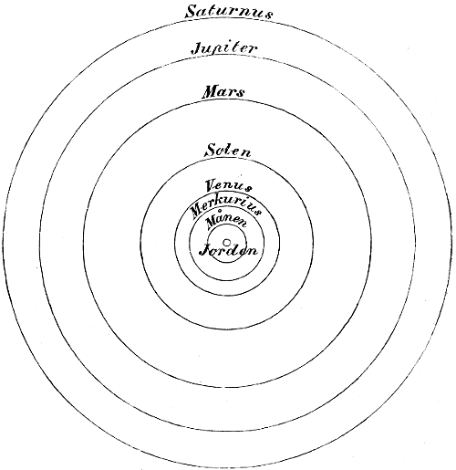 Efter hvad som blifvit framställt, är det lätt att förstå den vetenskapliga innebörden af det steg som togs af Kopernikus (1473-1543 e. Kr., domprost i Frauenburg). Han kände till fullo det Ptolemäiska systemet och var förtrogen med Pytagoräernas åsikter, äfven om det är tvifvel underkastat, huruvida han känt till Aristarkos. Kopernikus företog nu — hvad hufvudsaken beträffar — just de ändringar på det Ptolemäiska systemet, som vi nyss föreslogo och så var hans system i sina grunddrag färdigt. Själf yttrar han sig härom i sitt arbete på följande sätt: “Jag ställer mig på Martianus Capellas och andra romerska skriftställares ståndpunkt[2], hvilka anse, att Venus och Merkurius röra sig rundt omkring solen; därför blifva deras rörelser på båda sidor om solen begränsade och bestämda af radierna i deras banor. Dessa planeter röra sig ej kring jorden. Likaså omsluter Venus’ bana Merkurius’ bana. Hvarför kunna vi då icke, om vi utgå härifrån, hänföra Saturn, Jupiter och Mars till samma medelpunkt. Det behöfves blott att antaga passande radier för deras banor, hvilka böra ligga utom jordbanan. — Mellan Venus’ bana och Mars’ bana är ett tomt rum: det är där vi skola förlägga jordens bana och kring jordens bana månens, som icke kan skilja sig från jorden. Vi behöfva icke blygas för att jorden med månen årligen rör sig i en stor bana[23] kring solen, i sällskap med de andra planeterna. Antages solen orörlig, så kunna alla företeelser på himmelen förklaras genom jordens rörelse. Huru stora planetbanorna än äro, så äro de dock försvinnande i jämförelse med det tomrum, som skiljer dem från fixstjärnssferen. Allt detta kan synas svårt och hardt när otroligt; men med Guds hjälp skola vi göra det klarare än solen, åtminstone för alla, som begripa matematik. Utgå vi nu från den grundsatsen, som ingen lär bestrida, att ju större en bana är desto större är omloppstiden, så kunna vi förlägga banorna i följande ordning, i det vi börja med den yttersta.