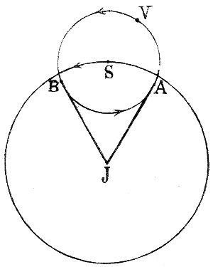 Till dessa exempel på åsikter, hvilka under forntiden utgjort föregångare till vår moderna uppfattning, kan ytterligare läggas följande. Vi hafva nämt, huru planeten Venus rör sig fram och tillbaka åt båda sidor om solen och aldrig mycket långt aflägsnar sig från solens grannskap, hvarför den ock går upp strax före eller ned strax efter solen såsom morgonstjärna eller aftonstjärna. Detta tyder på ett nära samband mellan solen och planeten. Också fann sig astronomen Heraklides häraf föranledd, att för förklaringen af planetens rörelse antaga Venus röra sig i en cirkel omkring solen, under det att solen själf, likasom äfven alla öfriga planeter, antogs beskrifva en cirkelformig bana kring den fasta jorden. Om saken förhåller sig så, är det ju påtagligt (se fig. 5, i hvilken J betyder jorden, S solen och V Venus) att Venus’ skenbara rörelse[16] på himmelen skall te sig sådan som vi iakttaga den, framåt- och tillbakaskridande, i det vi se den värkliga rörelsen aftecknad på himlahvalfvet. Hade Heraklides företagit samma anordning äfven af de öfriga planeterna, så skulle han hafva erhållit det system, som en tid efter Kopernikus uppstäldes af den danske astronomen Tyko Brahe, enligt hvilket samtliga planeter röra sig kring solen och solen med hela sitt följe af planeter kring jorden.