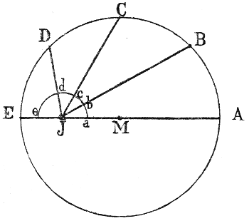 Hvilka voro då dessa oregelbundenheter? Där förekommo tvänne slag. Först och främst fans det två himlakroppar, nämligen solen och månen, hvilka värkligen rörde sig i cirkelformiga banor på himmelen, men icke likformigt, utan så, att rörelsen förändrade hastighet från punkt till punkt. Det är så det kommer sig, att årstiderna, som bero af solens årliga rörelse, icke äro lika långa, utan t. ex. vintern kortare än sommaren. Detta sökte man förklara på följande sätt. Solen rör sig visserligen i en cirkel och med jämn hastighet, men jorden ligger ej i cirkelns medelpunkt M (fig. 6), utan ett stycke därifrån i J (excentriskt). Oaktat nu solen på lika stora tider beskrifver de lika stora bågarna AB, BC, CD och DE[20] o. s. v., så blifva som man ser af figuren, de motsvarande vinklarna vid jorden ab, bc, cd och de olika. Sålunda kommer det sig, att dess rörelse, från jorden sett, synes vara ojämn. Detta är innehållet af den s. k. excenterteorien.
