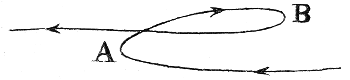 De öfriga himmelskropparna, planeterna, företedde dessutom en annan oregelbundenhet. Vi hafva omnämt huru planeten Venus äfvensom Merkurius synas skrida fram och tillbaka omkring solen och sålunda vända i sin rörelse i tvänne punkter (stationspunkter). Något liknande gäller äfven de öfriga planeterna. De skrida visserligen största delen af himmelen rundt i cirkelformiga banor, men då de komma till den trakt af himmelen, som ligger midt emot solens plats (i opposition mot solen), så beskrifva de en slinga med två vänd- eller stationspunkter A och B (fig. 7). Huru förklarades nu dessa afvikelser från den rena cirkelrörelsen? Låt oss t. ex. taga planeten Venus. Man tänkte sig då först en punkt S (se fig. 4) med likformig rörelse beskrifvande en cirkel omkring den fasta jorden J (deferentcirkel). Denna punkt S tänkte man sig såsom medelpunkt för en ny cirkel (epicykel = “cirkel på cirkel“), i hvilken planeten V tänktes röra sig likformigt. Det är nu tydligt, att om S låge stilla, så skulle planeten V från jorden synas svänga fram och tillbaka mellan två vändpunkter, som i fig. motsvaras af A och B. Men det är klart, att detta fortfarande blir fallet, äfven om punkten S med sin epicykel rör sig långsamt framåt i sin deferentcirkel. För att till fullo förklara den skenbara rörelsen, behöfde man ytterligare[21] blott antaga att punkten S rörde sig så, att den ständigt låg åt samma håll som solen från jorden räknat. (Jämf. härmed Heraklides’ system.) På detta sätt kunde man förklara Venus’ och Merkurius’ rörelser. Genom en ringa ändring af ofvanstående figur kunde man äfven göra sig reda för de öfriga planeternas rörelser och deras stationspunkter. Detta var den s. k. epicykelteorien.