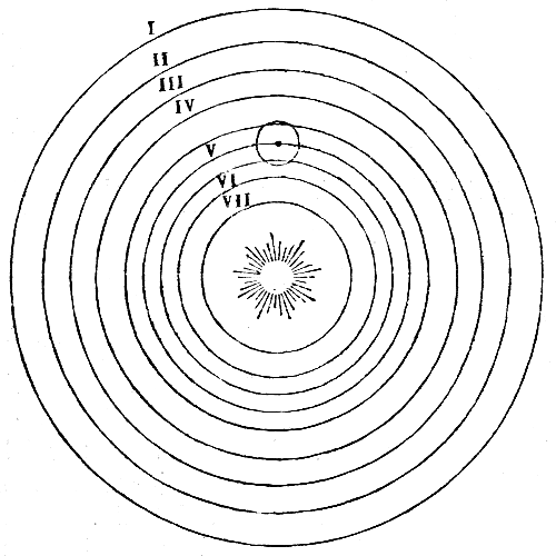 Den första (I) är fixstjärnssferen. Den är orörlig och till den hänföras alla stjärnors rörelser och lägen i vår värld. Astronomerna antaga den samma rörlig; men vi skola visa, att detta är en synvilla, beroende af jordens rörelse. Under stjärnssferen är Saturnus’ (II) bana, hvars omloppstid är 30 år; sedan komma i ordning banorna för Jupiter (III) med 12 års omloppstid, Mars (IV) med 2 års omloppstid, Jorden (V) med månen med ett års omloppstid, Venus (VI) med 9 månaders och Merkurius (VII) med 82 dagars omloppstid. I medelpunkten för alla dessa banor tronar solen. Kunde man hafva gifvit en lämpligare plats åt denna klara stjärna, som upplyser detta härliga tempel?“