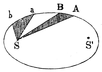 Likasom Kepler frigjorde sig från antagandet af en cirkelformig rörelse, så afstod han äfven från antagandet, att rörelsen var likformig. Lika fördomsfritt som han undersökte planetbanornas rundning, företog han sig att studera den hastighet, med hvilken planeterna löpte i sina banor ifrån punkt till punkt. Han upptäckte sålunda, att planetens hastighet ändrar sig från punkt till punkt af dess bana, ifrån det läge, där den är närmast solen, då hastigheten är störst, tills den är längst aflägsen från solen, då hastigheten är minst. Denna ändring fann han dessutom försiggå på sådant sätt, att planetens s. k. radius vektor (afståndet från solen till planeten) på lika stora tider öfverfar lika stora ytor. Om planeten på två lika långa tider beskrifver de båda olika styckena AB och ab af sin bana (se fig. 9), så äger alltid ett sådant samband rum emellan dessa båda sträckor, att de i figuren skuggade ytorna äro lika stora, och detta hvar än dessa bågar AB och ab befinna sig på planetbanan. Detta var Keplers andra lag, för hvilken han af en samtida astronom fick uppbära den tillvitelsen, att hafva omändrat det kopernikanska systemet, “för att gifva ett slag åt kristendomen, på hvilken han öfverflyttat sitt hat mot de andlige“. — Slutligen upptäckte Kepler, att planeternas afstånd från solen äro på ett visst sätt ordnade, i det att planeternas omloppstider och afstånd stå i samband med hvarandra. Detta samband är sådant, att om man väljer en planet, multiplicerar dess omloppstid med sig själf och dividerar resultatet med hvad man erhåller, om man två gånger multiplicerar planetens afstånd från solen med sig själft, så erhåller man samma resultat, hvilken planet man än valt; eller annorlunda uttryckt: kvadraterna på omloppstiderna förhålla sig som kuberna på medelafstånden. Detta var Keplers tredje lag. Enligt den samma kan man utan vidare beräkna en planets afstånd ifrån solen, om man iakttagit, huru stor hans omloppstid är.