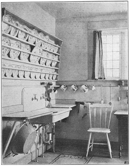 To house-builders I would urge that it pays to have a white enamelled sink, and to insist that no sand-soap or scouring soap be used on it, as this removes the finish and makes it less easy to keep it spotless. See that a package of one of the cleaning powders is placed near the sink, convenient for use the first time the maid looks about for materials, and over the sink on small hooks have hung two or three different shaped sink brushes. An enamelled soap-dish should be fastened above the sink, and on the left of it a grooved, slightly slanting draining board for washed dishes; hanging under this on a large hook should be the enamelled dishpan and back of it a wire drainer, both hanging free from the wall.