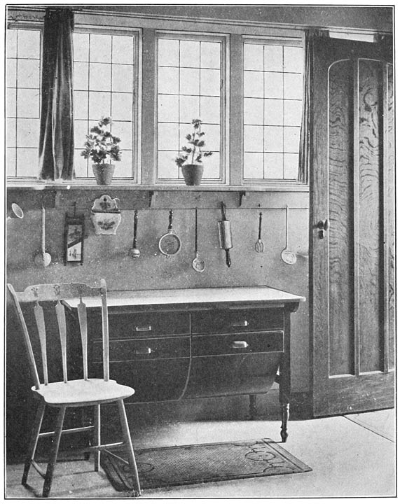 Any kitchen can have a chair-rail put around it, and this four-inch wide board should be arranged with small hooks placed at a distance of ten or twelve inches apart, and on these should hang the enamelled spoons, strainers, egg-beater, small jugs, and the saucepans, the bottoms of these being always in evidence and not out of sight in cupboards. The Europeans have always had their cooking [30]utensils displayed as a part of the kitchen furnishing, and when this is done there is less temptation to neglect their absolute cleanliness.