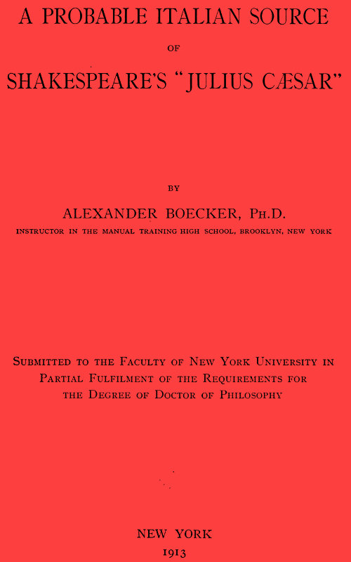This monograph was submitted to the Faculty of New York University in partial fulfillment of the requirements for the degree of Doctor of Philosophy, and was accepted by them in May, 1912. Its composition was prompted chiefly by a desire to call attention to the long forgotten work of Orlando Pescetti, because it is at least an open question whether Shakespeare derived from the “Cesare” of the Italian dramatist many hints which he later used in his own “Julius Caesar.” Pescetti’s drama seems to have been entirely overlooked as a possible source, although the many striking similarities to Shakespeare’s tragedy render it well worth investigating. I believe that the present work is the first attempt to demonstrate the possible relation between the two dramas.